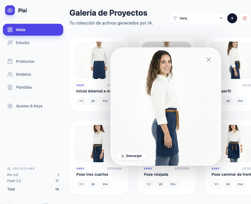 Filtra por proyectos, compara versiones y descarga tus favoritas con un solo click, manteniendo tu espacio de trabajo siempre limpio.